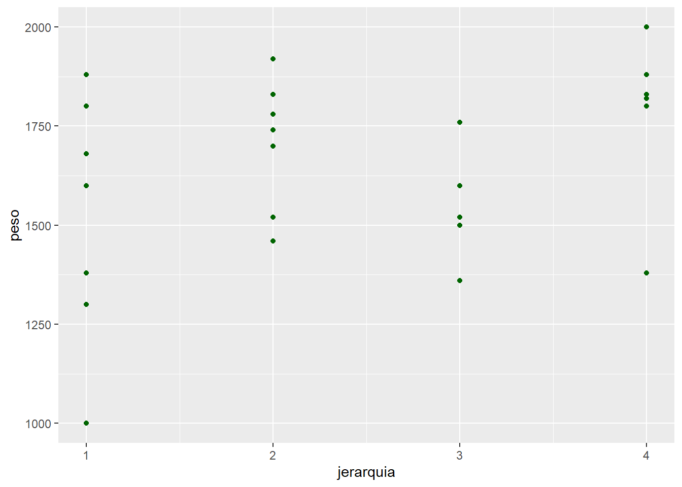 ggplot(pollos_peso, aes(x = jerarquia, y = peso)) +geom_point(color ="darkgreen")