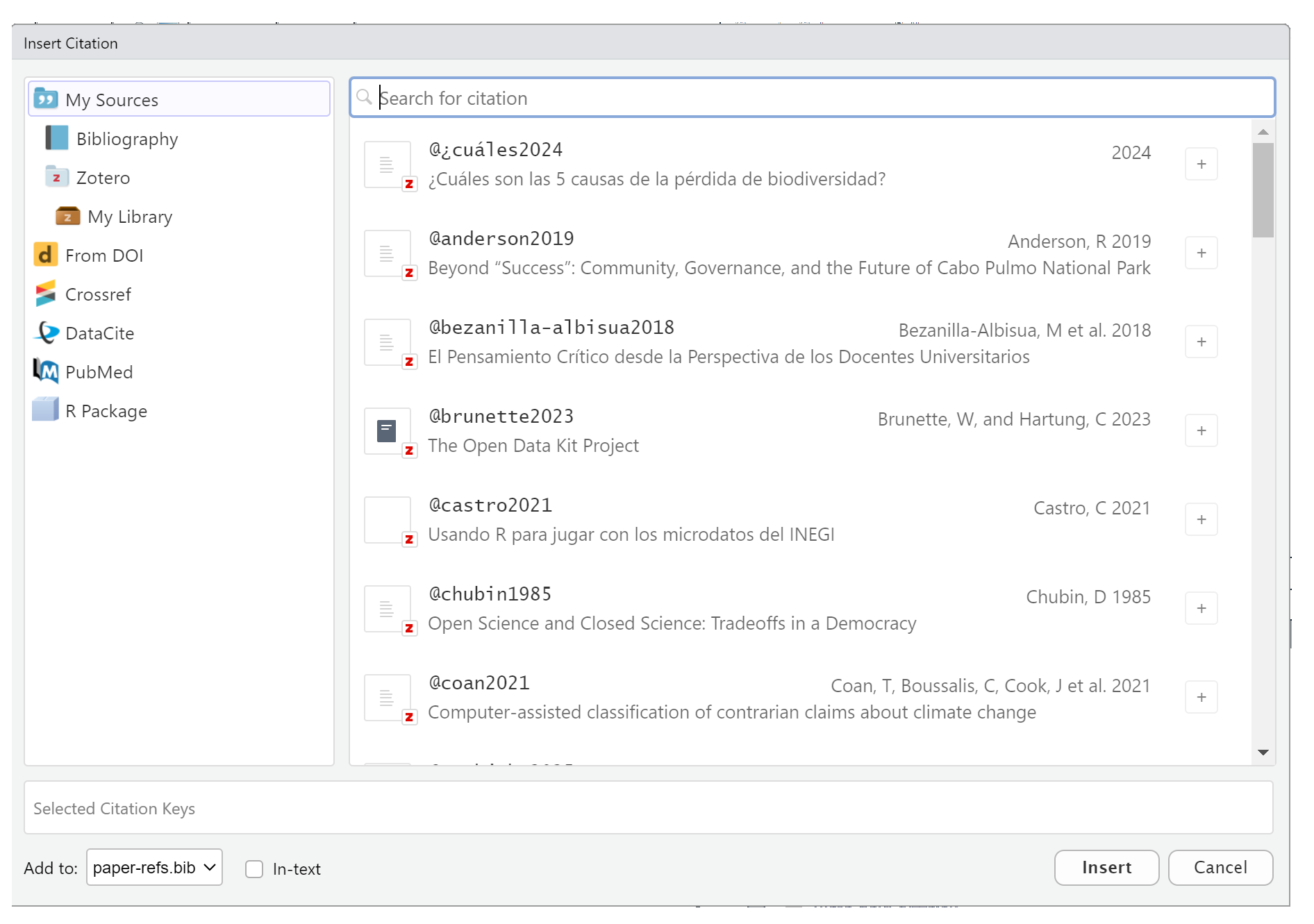 A continuación un ejemplo: La cita es de Equihua Zamora, Pérez Maqueo, y Equihua Benítez (2024) y agregas una lista de citas al final de un texto poniendo las claves separadas por “;” y todo dentro de paréntesis cuadrados (Equihua y Perez-Maqueo 2004; Martinez, Costanza, y Pérez-Maqueo 2011).