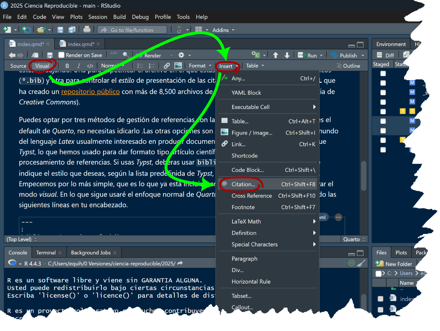 Puedes optar por tres métodos de gestión de referencias con la opción cite-method. La variante citeproc es el default de Quarto, no necesitas idicarla pero puedes hacerlo. Las otras opciones son biblatex y natbib, que vienen del mundo del lenguaje Latex. Además Hay que decir que Typst, lo que hemos usado para dar formato tipo artículo científico, tiene su propio sistema de procesamiento de referencias. Si usas Typst, deberas usar bibliographystyle con una línea que indique el estilo que deseas, según la lista predefinida de Typst, o usar un nombre de archivo CSL. Empecemos por lo más simple, que es lo que ya está incluido en RStudio. Para esto conviene activar el modo visual. En lo que sigue usaré el enfoque normal de Quarto. Prepara tu documento agregando las siguientes líneas en tu encabezado.