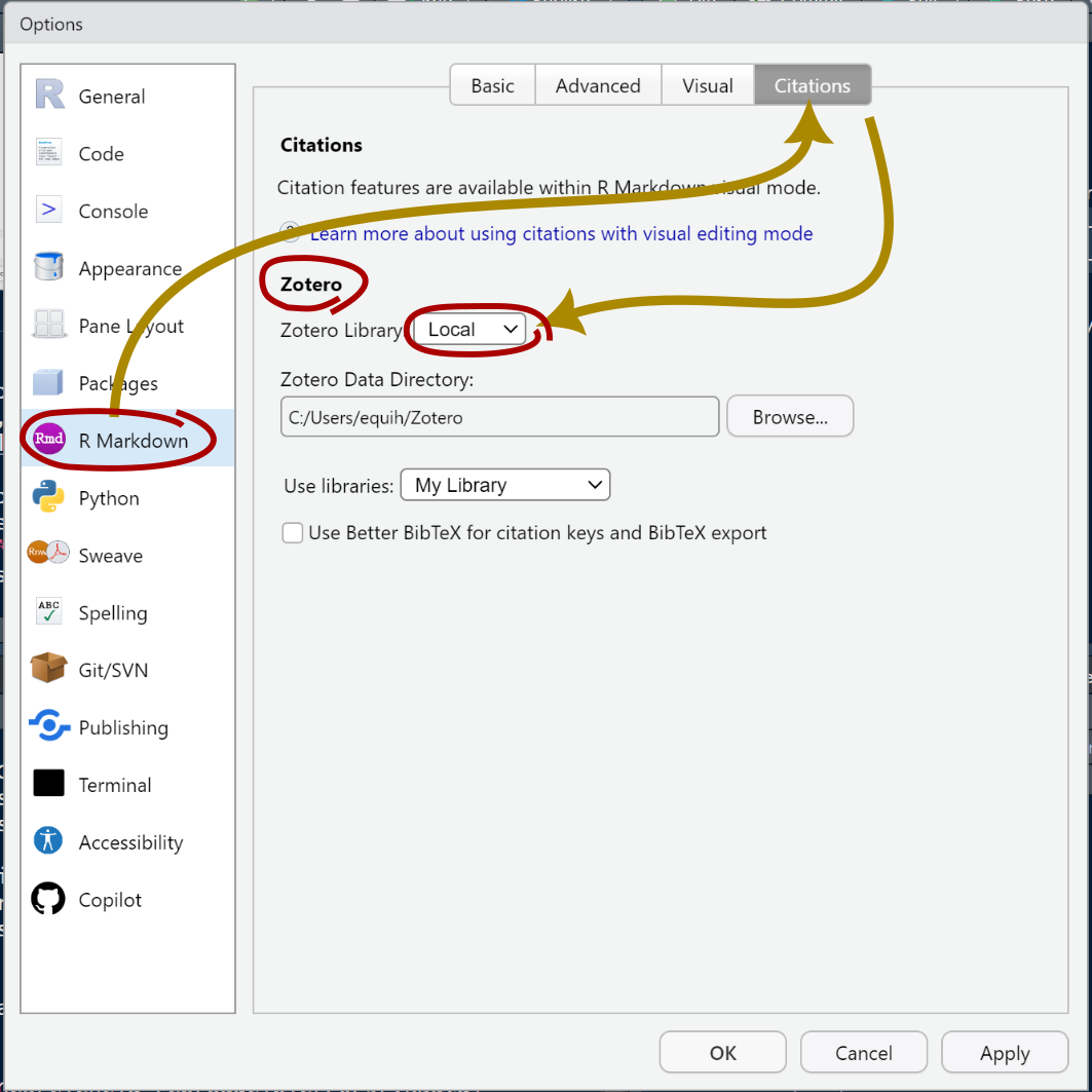 En las opciones, busca R Markdow y ahí, la pestaña Ciations. Ahí defines tus preferencias para interactuar con Zotero. Si lo tienes instalado en tu equipo como yo, te conviene elegir local. Esto abre una serie de posibilidades para interactuar dinámicamente con las capacidades de ambas aplicaciones.