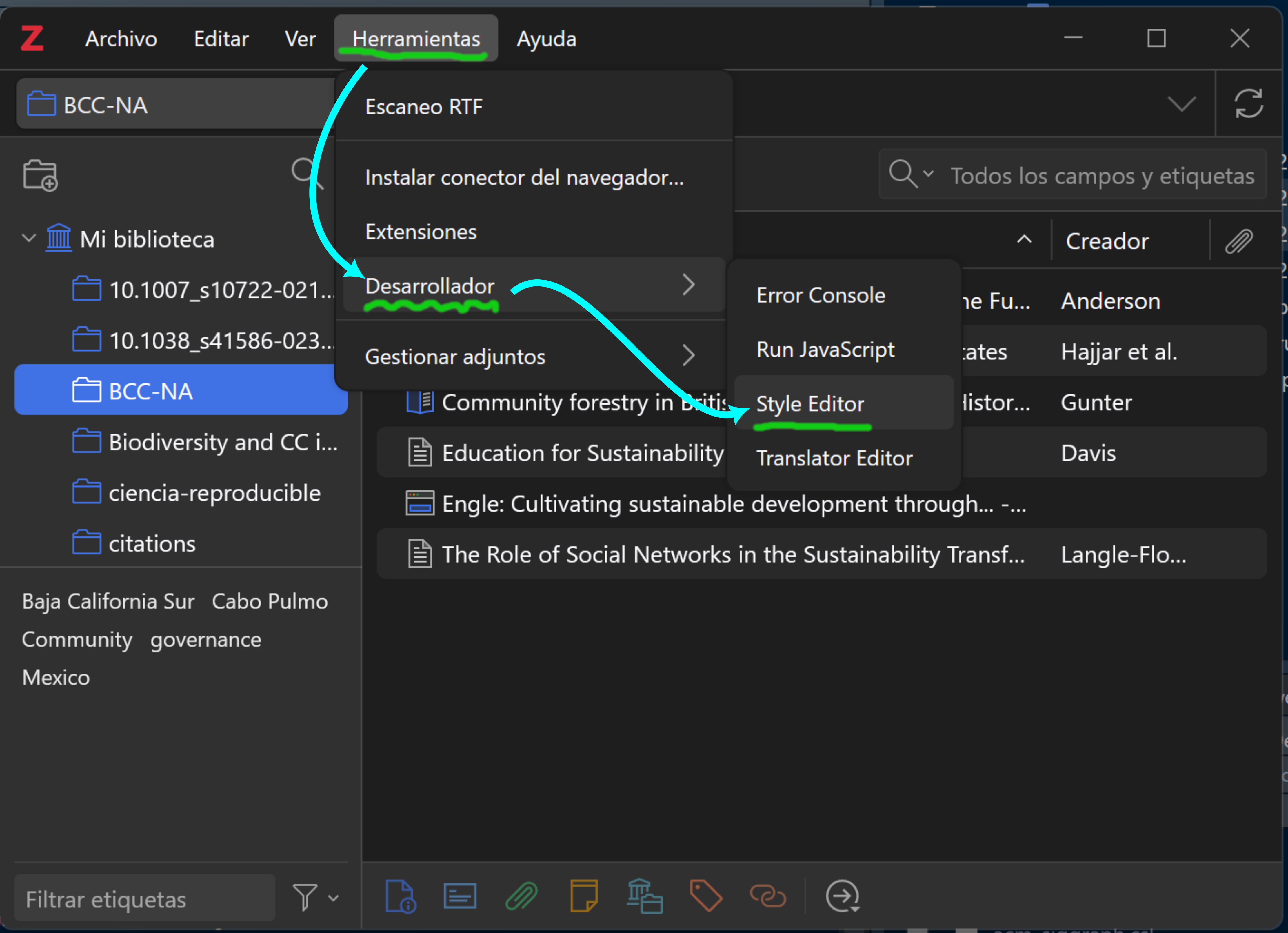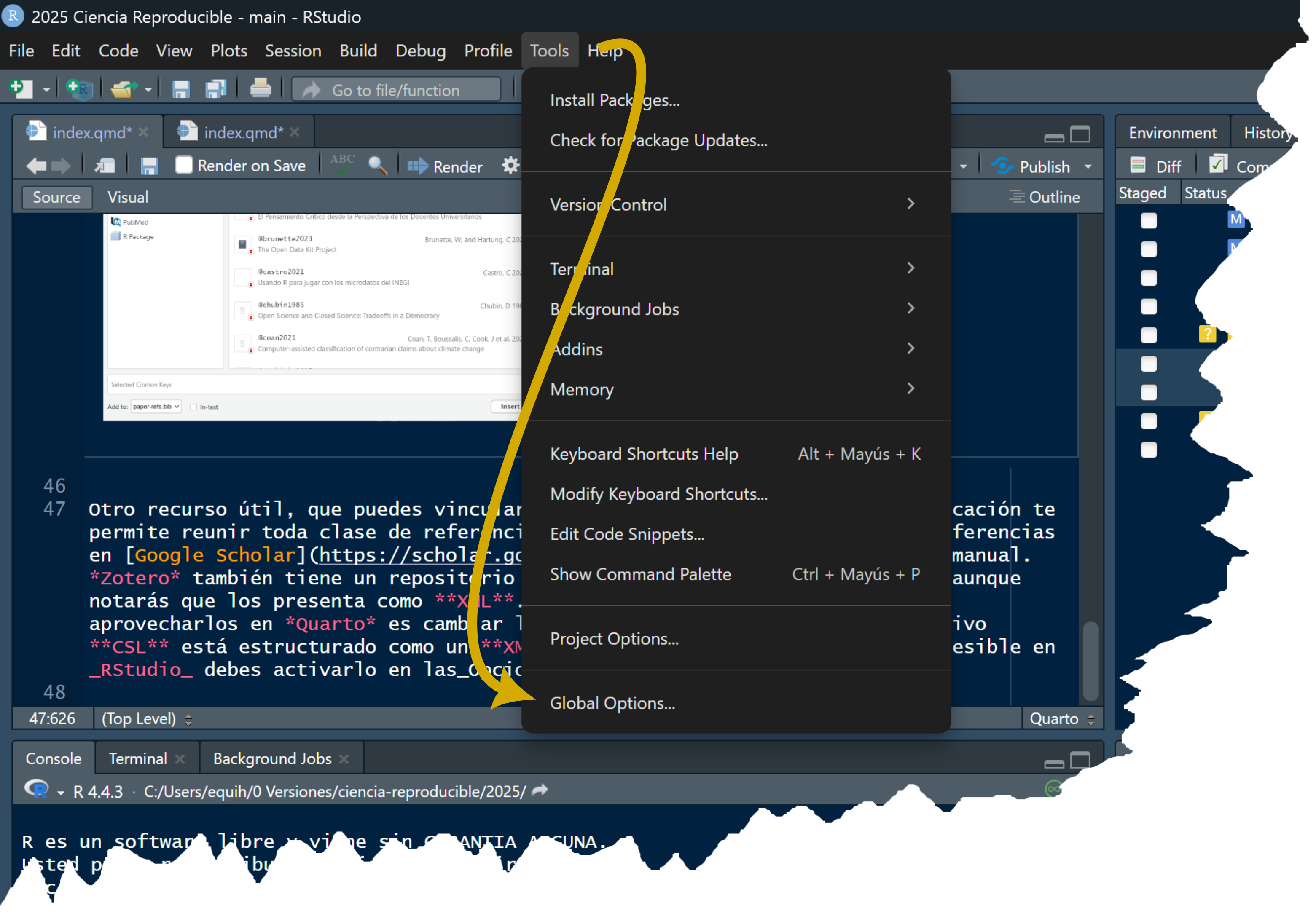 Otro recurso útil, que puedes vincular con RStudio es Zotero. Esta aplicación te permite reunir toda clase de referencias, desde referencia a sitios Web, referencias en Google Scholar y desde luego, la captura manual. Zotero también tiene un repositorio de archivos CSL que puedes usar, aunque notarás que los presenta como XML. Lo único que tienes que hacer para aprovecharlos en Quarto es cambiar la extensión, pues en realidad un archivo CSL está estructurado como un XML. Si tienes instalado Zotero, entonces podrás usar la herramienta de edición de estilos que puedes abrir desde el menu Herramientas/Desarrollador, puedes elegir lo que desees y guardar directamente en formato CSl. Con este editor puedes incluso seleccionar variantes apropiadas para las preferencias del idioma y país de tu elección. Para hacer que Zotero esté accesible en RStudio debes activarlo en las_Opciones Globales.