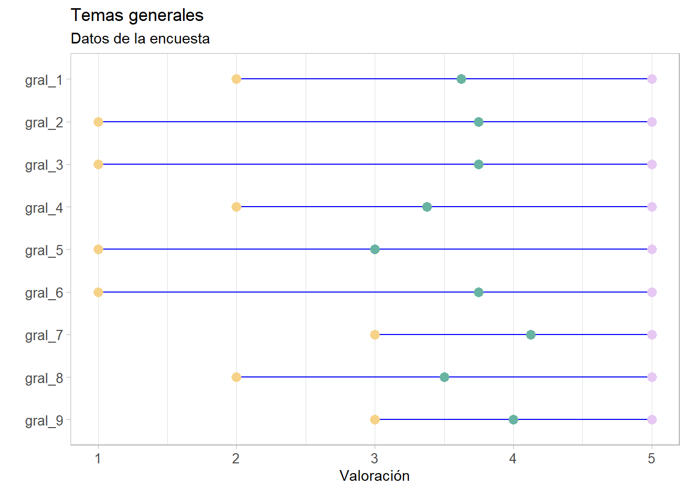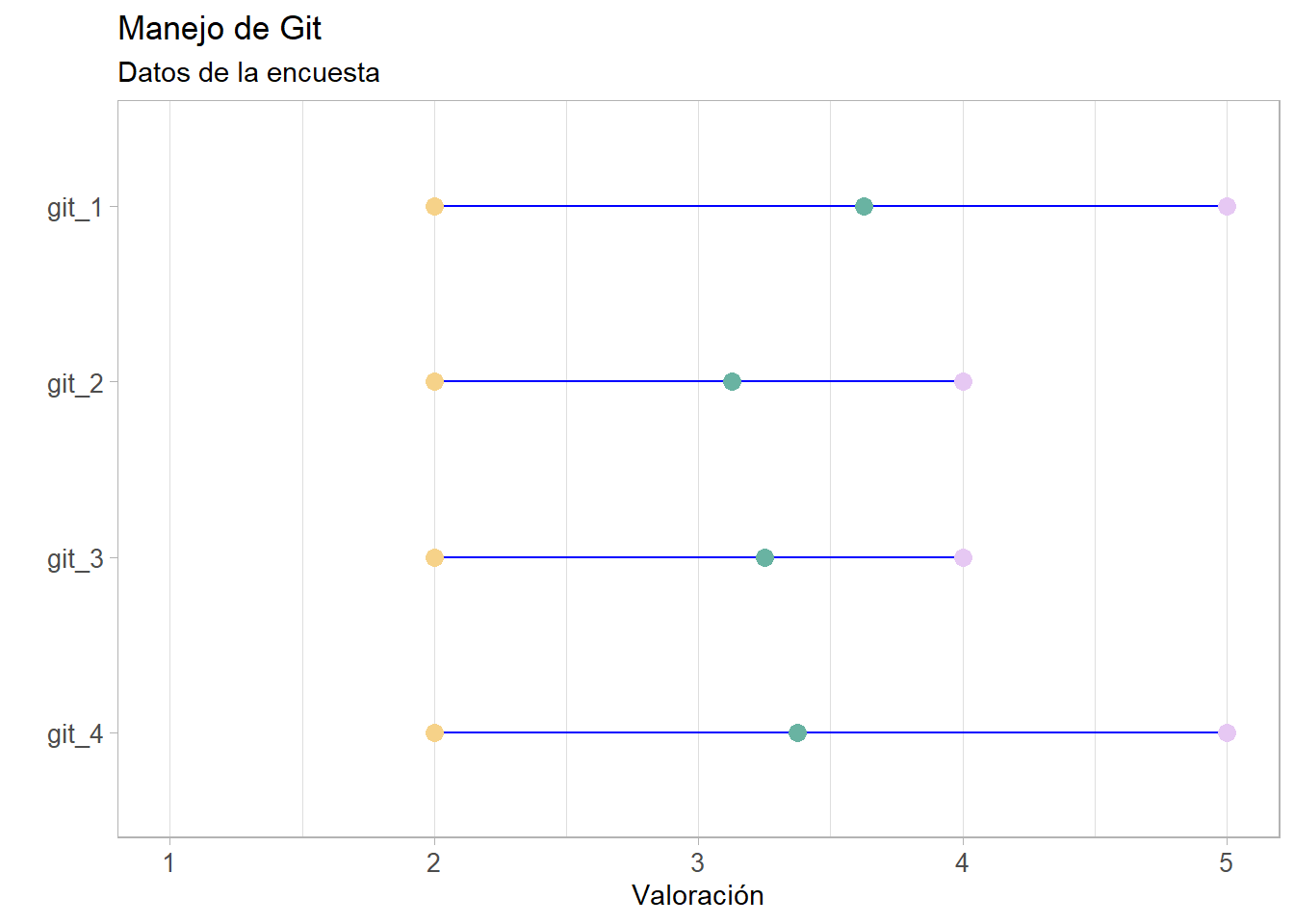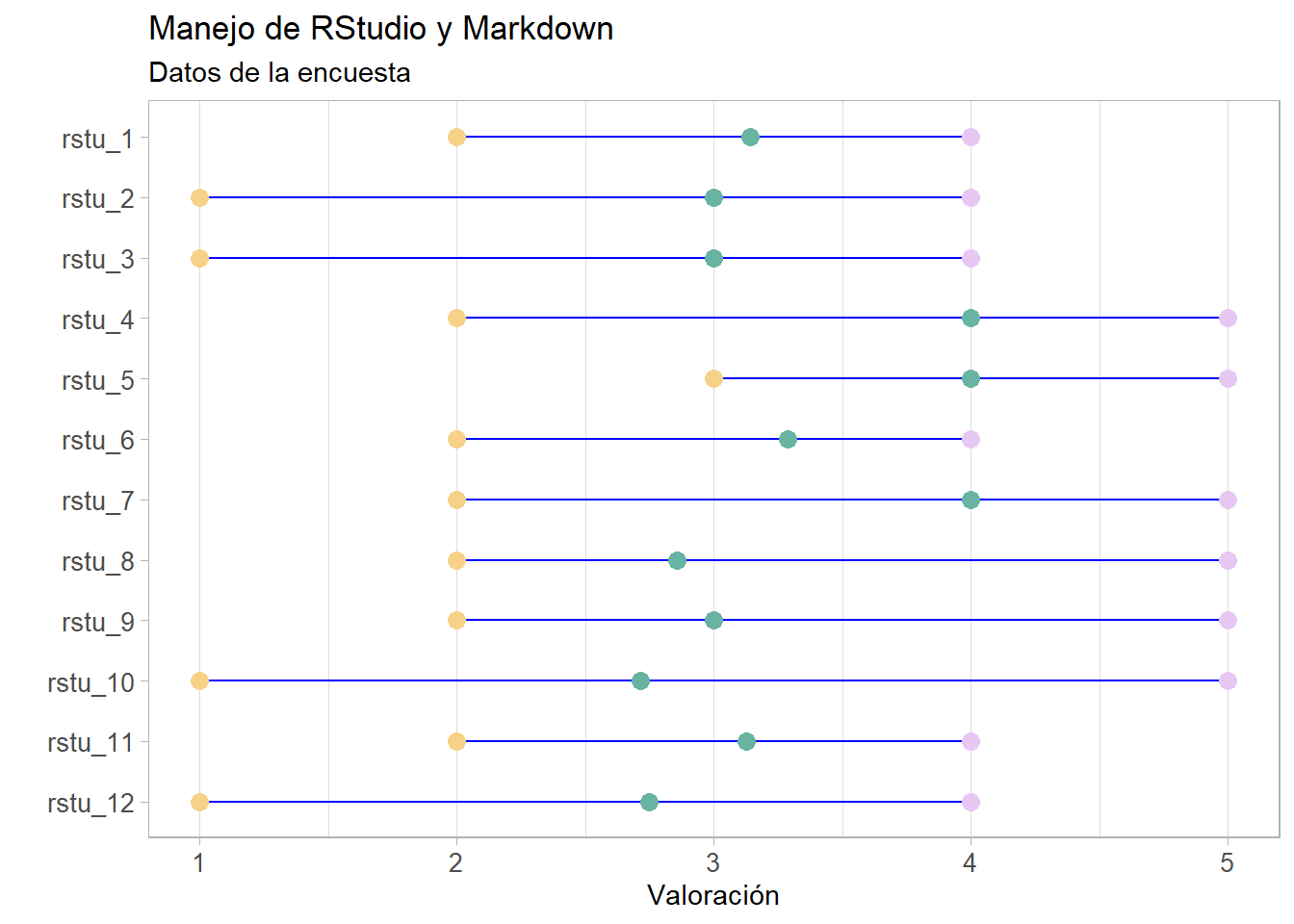 promedios |>filter(str_detect(var, pattern ="rstu")) |>mutate(var =ordered(var, levels =c("rstu_1","rstu_2","rstu_3","rstu_4","rstu_5","rstu_6","rstu_7","rstu_8","rstu_9","rstu_10","rstu_11","rstu_12"))) |>ggplot(aes(x = var, y = prom)) +geom_segment(aes(x = var, xend = var, y = min, yend = max), color="blue") +geom_point(size=3, color="#69b3a2") +geom_point(size=3, color="#F6D289", aes(y=min)) +geom_point(size=3, color="#E6C8F3", aes(y=max)) +coord_flip() +scale_x_discrete(limits=rev) +theme_light() +theme(panel.grid.minor.y =element_blank(),panel.grid.major.y =element_blank(),axis.text =element_text( size=10 )) +ylab("Valoración") +xlab("") +labs(title ="Manejo de RStudio y Markdown", subtitle = etiqueta) +ylim(c(1, 5))