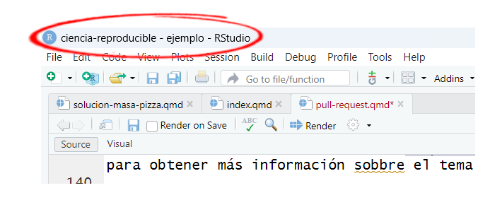 - Un problema que encontramos el año pasado fue la de operar RStudio fuera del proyecto de interés en forma inadvertida. Te sugiero siempre verificar que estés trabajando con el proyecto que deseas. La indicación la hace claramente RStudio en la equina superior izquierda. No sólo indica ahí el nombre del proyecto, si Git está habilitado, también indica la rama en la que estás trabajando. Si lo que se muestra es solamente RStudio, estás fuera de todo proyecto. Ve a File → Open Project o File → Recent Projects y abre el que deseas sea tu base de trabajo.
