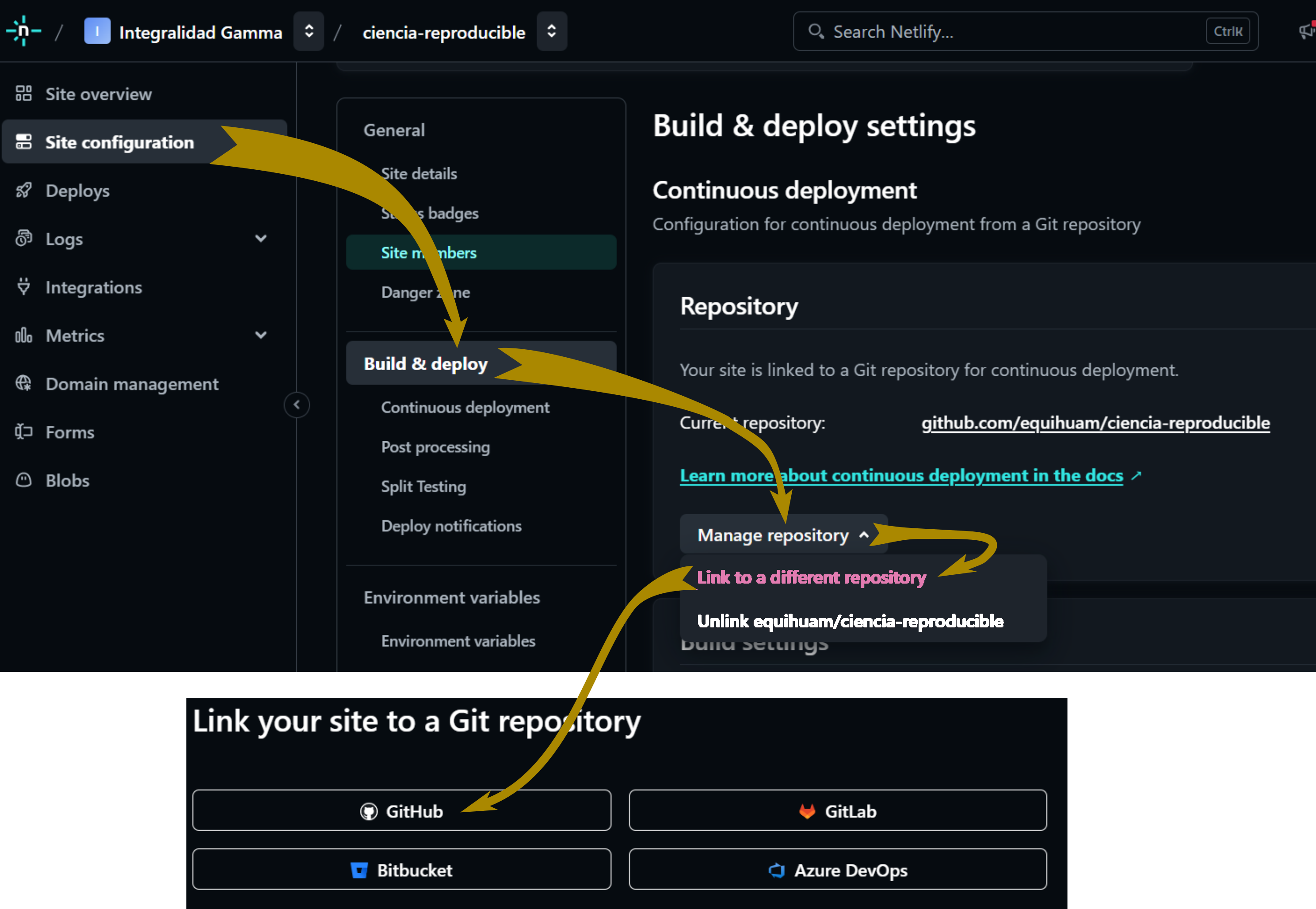 usethis::create_from_github("equihuam/ciencia-reproducible", fork = TRUE), se hizo correctamente la copia, se obtuvo un clón del nuevo repositorio, etc. Sin embargo, el acceso al nuevo repositorio apareció inhabilitado (pull y push grises). Es seguro que esto se deba a un problema de configuración del proyecto. My probablemente tenga que ver con los permisos con los que estás operando y eso lo controla el token que tienes registrado. Pudieran ser también algunas otras cosas. Para empezar a explorar el problema lo mejor será usargit_sitrepocomo sugiere Matthew Carson, que además de mostrarte detalles de configuración te sugerirá en dónde puede haber problemas y la forma de buscar solución al problema detectado. - En el vínculo entre Github y Netlify anotaste la rama de interés para publicar que no es la que querías. La solución es redefinir el repositorio de origen. En la figura te sugiero como acceder a esto. Básicamente la idea es reconstruir el vínculo entre Github y Netlify eligiendo los datos correctos de rama y directorio.
